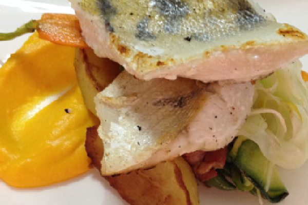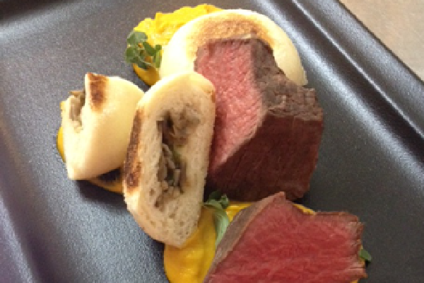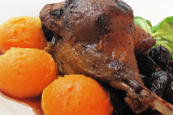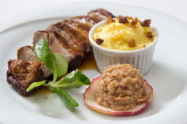 Medaillons of pork rolled in bacon with sauce of Merlot and fondant potatoes